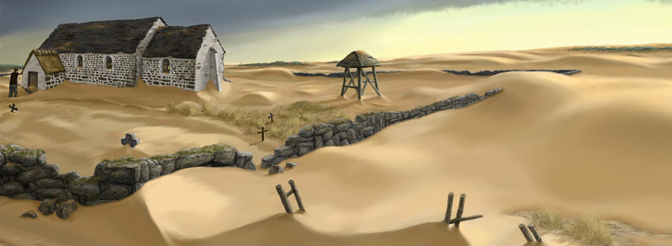 Nr. Lyngby Kirke Efter at sandflugten havde gjort det umugeligt for menigheden at bruge kirken, begyndte havet at gøre indhug i klinten. Det blev derfor besluttet at tage kirken ned, og bruge materialerne på en ny kirke, der ligger lidt længere |